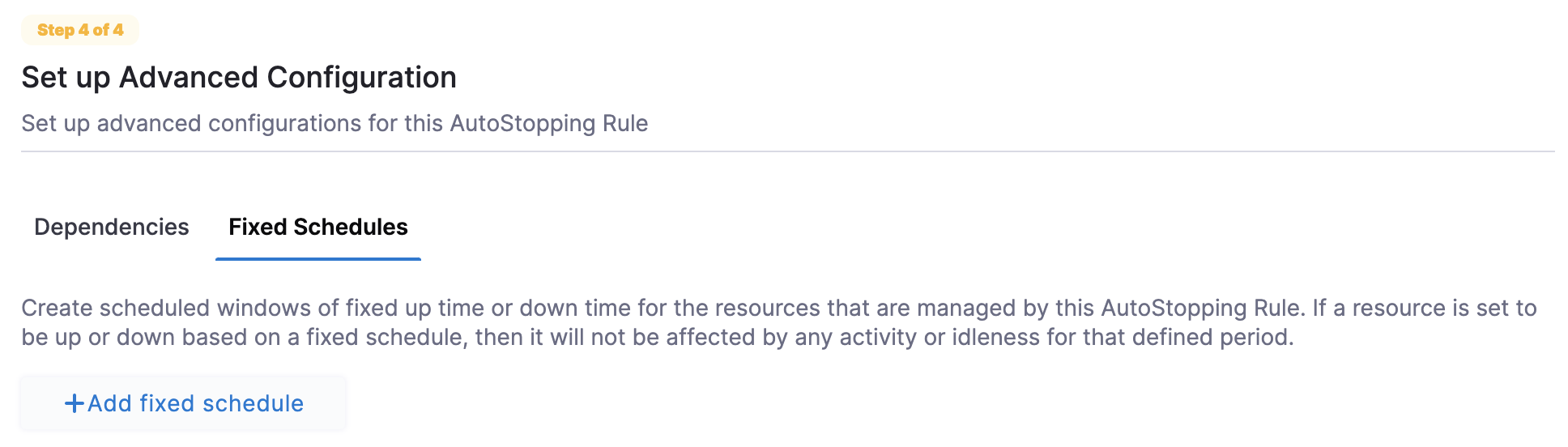 Create fixed uptime or downtime schedules for the resources managed by this AutoStopping Rule. When a resource is configured to go up or down on a fixed schedule, it is unaffected by activity or idleness during that time period.
