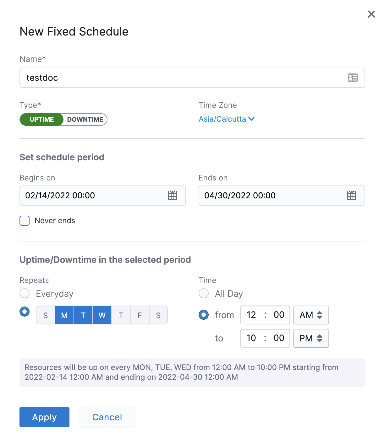 In the following example, resources will be up every Mon, Tue, Wed starting from 12:00 a.m. on February 14, 2022 till April 30, at 10:00 p.m.Example 2: