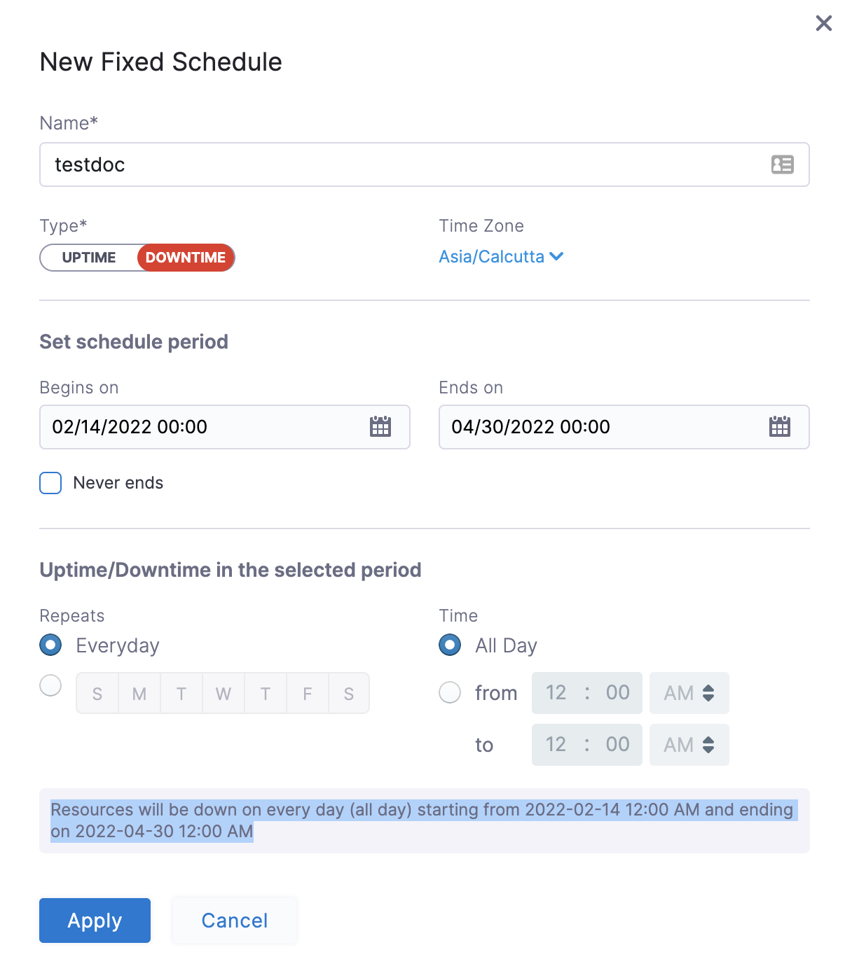 resource. During this window, the resource will be forced to go down regardless of the defined rule. You can choose to specify uptime for your resources in the same way.