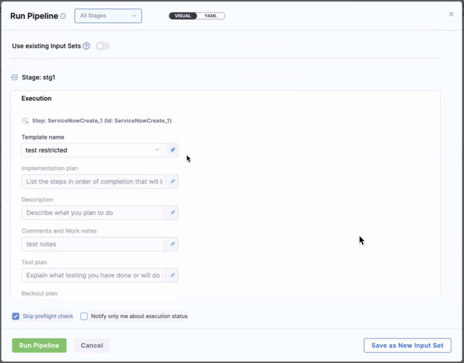- Remember that you should only add ServiceNow Create to a stage if you want to create a new ServiceNow ticket on every run of the stage.