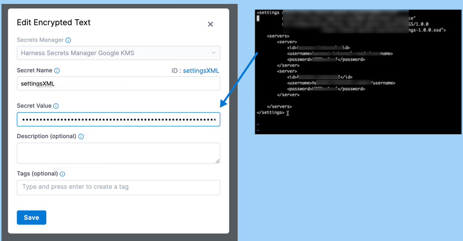 . Take note of the ID. You need it to reference the secret in your pipeline. - In Secret Value, paste the XML settings content from your