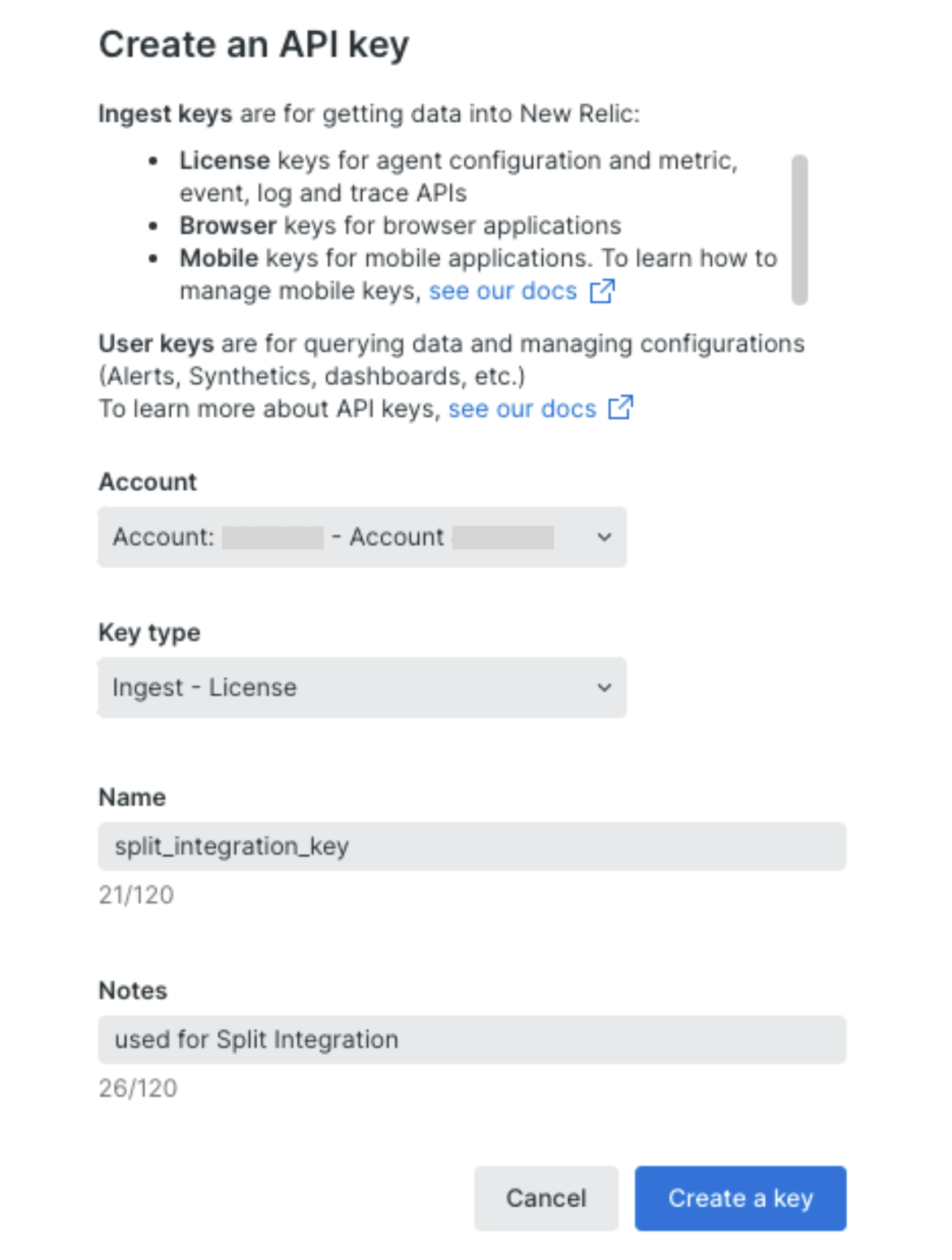 Paste the Account ID and Key you copied in step 5 of the New Relic instructions.