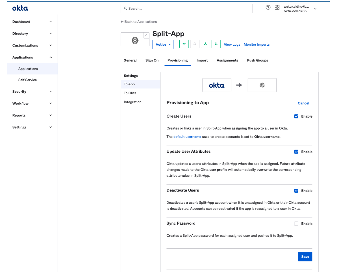 • User management actions such as Deactivate and Activate is disabled in Split. Okta administrators control the user management within Okta.