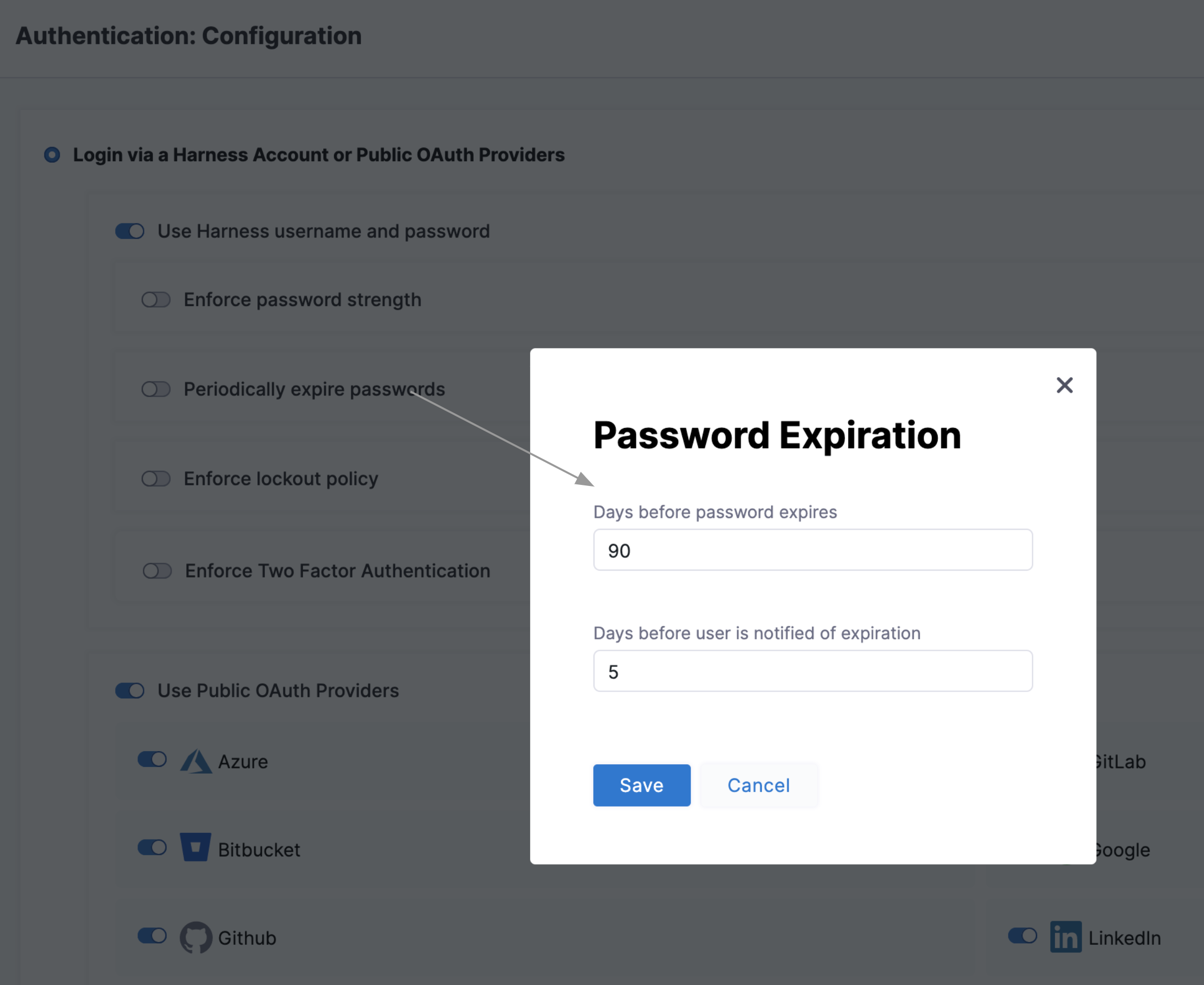 Select Periodically expire passwords to set an interval at which users must refresh their Harness passwords. In the same dialog, you can also set an advance notification interval.
