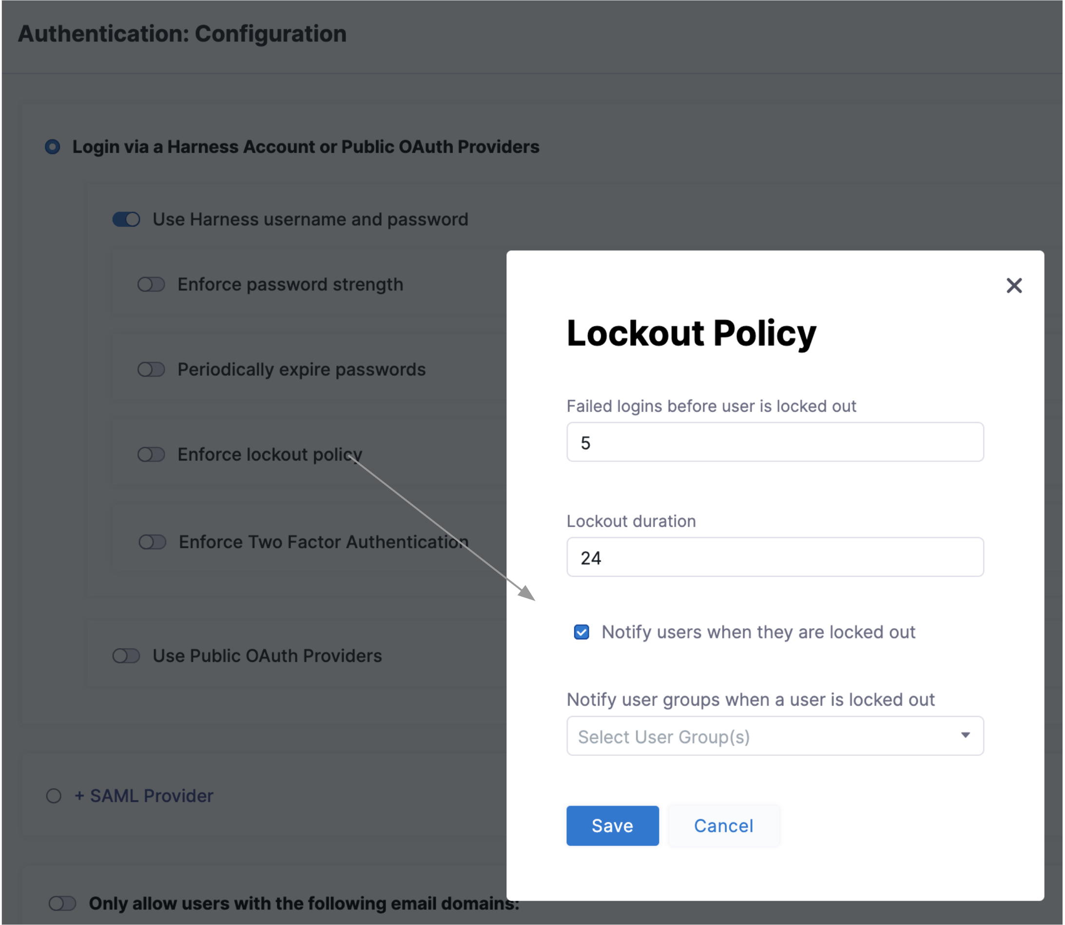 Select Enforce lockout policy to open the dialog shown below. It offers independent controls over the lockout trigger (how many failed logins), lockout time (in days), and notifications to locked-out users and to Harness user groups.