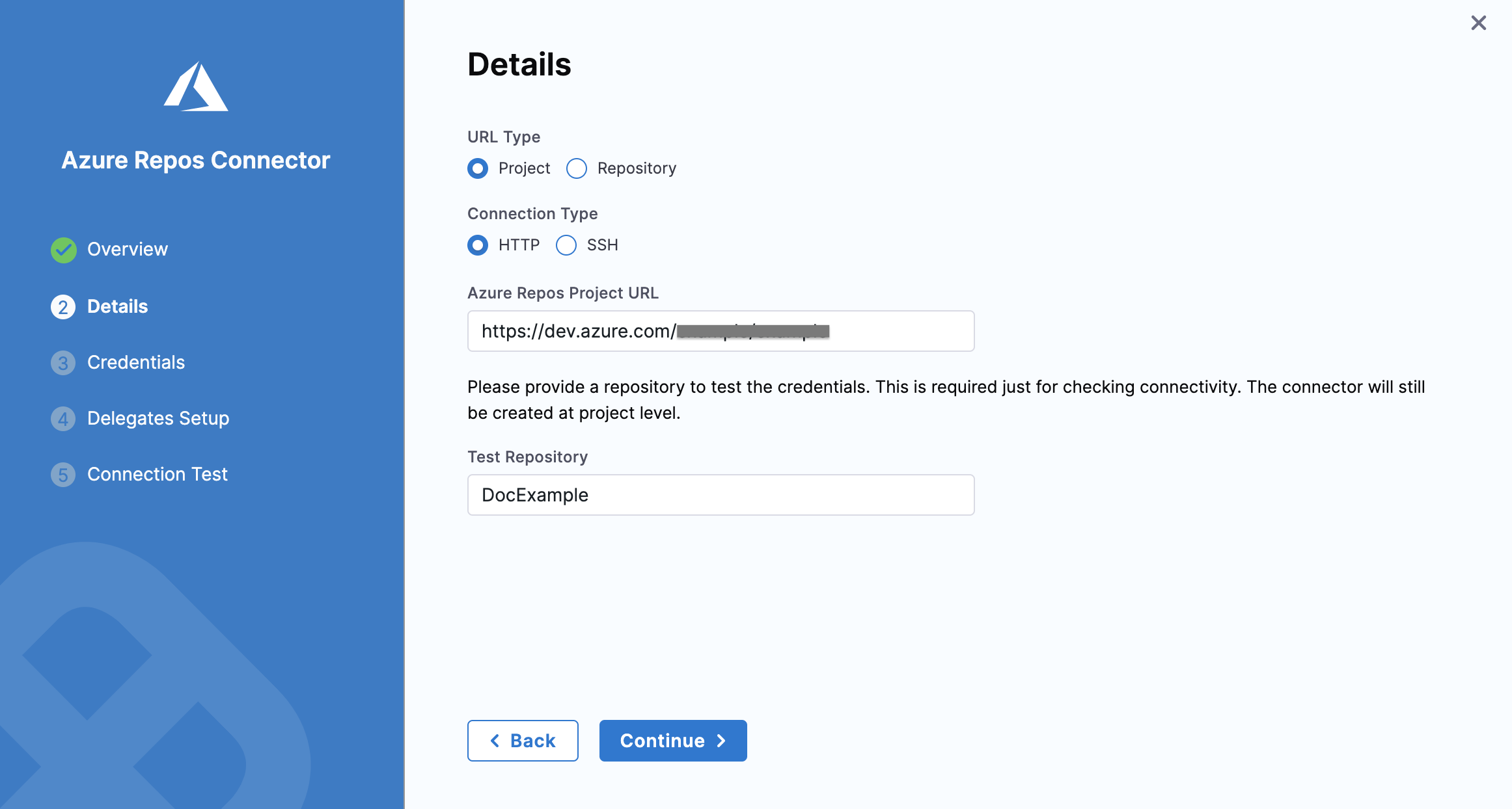 If you selected Project, in Test Repository, enter the name of a repository that Harness can use to test the connector's connection.