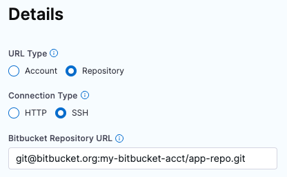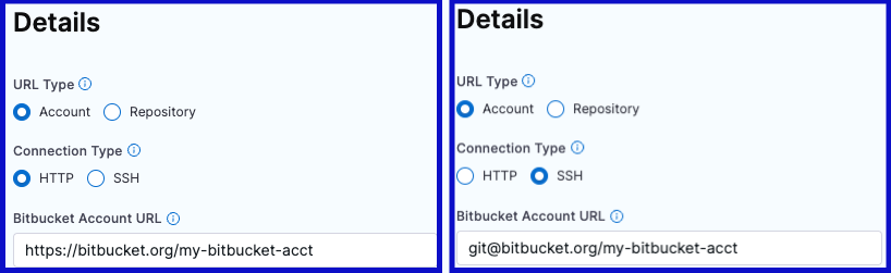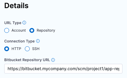 Select the protocol, HTTP or SSH, to use for cloning and authentication. The Connection Type determines the URL format required for the Bitbucket Account/Repository URL field. It also determines the Authentication method you must use in the Credentials settings.