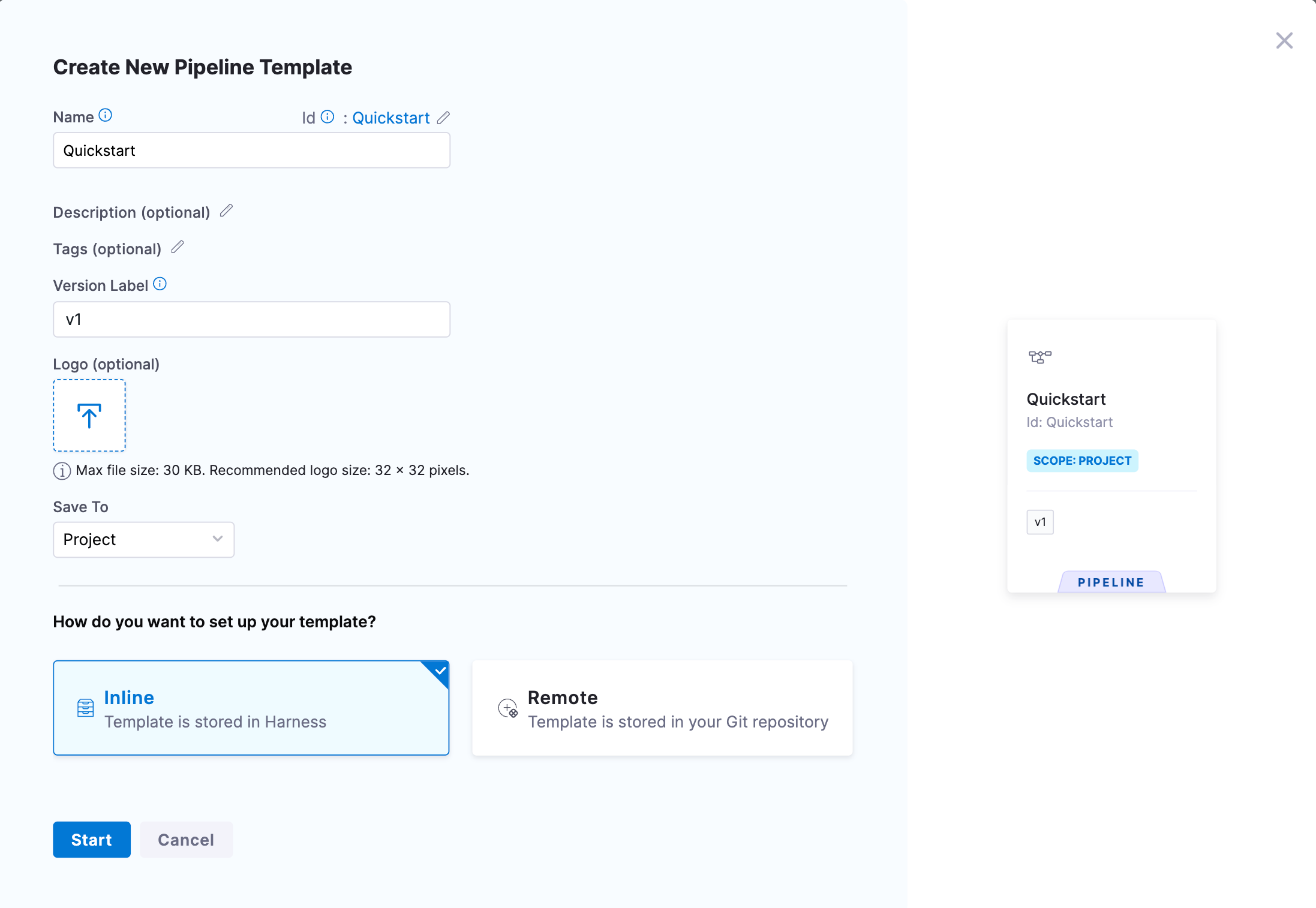 . There are three Save To options that declare the scope where the template is created. - Set up the template to be stored inline (in the Harness Platform) or in a remote Git repo.