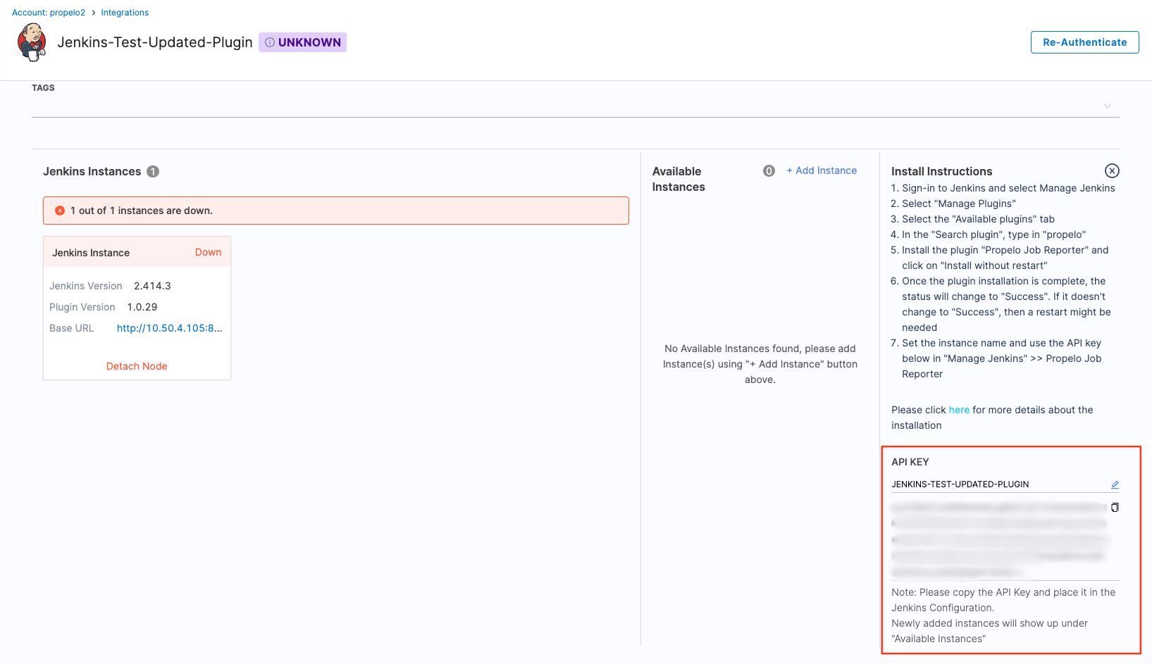 After reconfiguring the plugin, it may take 10 to 15 minutes for the Jenkins integration instance to establish a connection. Once the connection is successful, the status of the Jenkins integration instance will change to Operational.