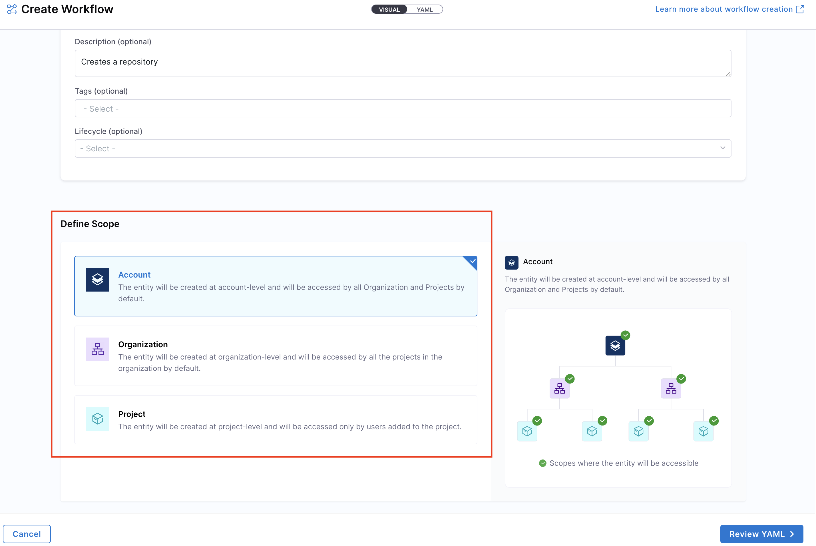 - If no scope is selected, the scorecard evaluates entities across all scopes (account, org, and project).